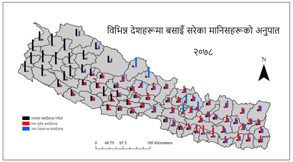 नक्सामा देखाइएको बार ग्राफ प्रत्येक जिल्लाको कुल विदेशमा भएका जनसंख्याको अनुपात हो। नेपालको नक्सामा देखाइए अनुसार पश्चिम नेपालका तराईदेखि हिमालसम्मका जनताहरूको गन्तव्य भारत हो। उत्तरपूर्वी हिमाली जिल्लाका मानिसहरू भारतमा जाने क्रम कम र मध्यपूर्व तथा अन्य देशमा जाने क्रम बढी देखिन्छ। पूर्वका सबै जिल्लाहरूमा भारत जाने क्रम न्यून र अन्य देशमा जाने क्रम बढी छन्। मधेश प्रदेशका जिल्लाहरू भारतनजिक भएर पनि मध्यपूर्व जाने क्रम बढी देखिन्छ। काठमाडौं वरपरका जिल्लाहरू र उच्च हिमाली जिल्लाका मनाङ र मुस्ताङ जिल्लाबाट धरै टाढाका देशहरूमा बसाइँ सर्नेको अनुपात बढी देखिन्छ।
