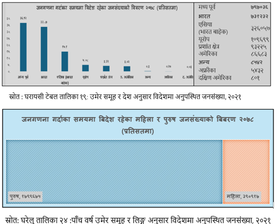 २०७८ मा राष्ट्रिय तथ्याङ्क कार्यालयले विभिन्न देशहरूलाई फरक-फरक क्षेत्रमा विभाजन गरी विदेशमा गई बसोबास गर्ने नेपालीहरूको विवरण राखेको छ। यसरी हेर्दा मध्यपूर्वी देशहरूमा सबैभन्दा बढी वा ८ लाख ५ हजार नेपालीहरू गएर बसेका छन् वा काम गरिरहेको देखिन्छ। त्यस्तैगरी, भारतमा ७ लाख ३१ हजारको हाराहारीमा रहेको देखिन्छ। भारतबाहेकका अन्य एसियाका देशहरूमा ३ लाख २६ हजार रहेको देखिन्छ। युरोप, क्यानडा, अष्ट्रेलिया र अमेरिका गरी जम्मा २ लाख ९५ हजारको हाराहारीमा रहेको देखिन्छ। विदेश गई बसोबास गर्ने महिला र पुरुषको अनुपातमा भने ठूलो भिन्नता देखिन्छ। कुल विदेशमा बसोबास गर्ने नेपालीहरूमध्ये जम्मा १८ प्रतिशत महिला र पुरुष ७२ प्रतिशत रहेको देखिन्छ। माथि भनिएजस्तो धकेल्ने शक्तिको कारण ७.५१ प्रतिशत विदेश गए भने देशमा विद्यमान तान्ने शक्तिको करण २.९७ प्रतिशत विदेशमा जन्म भई नेपाल आएर बसोबास गरेको पनि पाइन्छ।